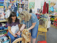 Last night at the store Ashley Martineau taught her fancy plying techniques, how to ply "rope", seashells, boobles and coils. It is amazing what each participant made from just two bobbins of single plies. A little samples of their finished products are above. Ideas of what people can make with this very creative yarn were flying throughout the store. She will be offering her great classes again in August!